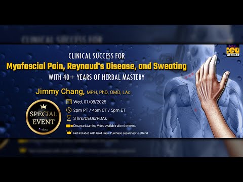 Myofascial pain, Reynaud's disease, and excessive sweating can severely impact a patient's quality of life. In this course, Dr. Jimmy Chang shares over 40 years of clinical experience using his unique "Herbal Master Sheet" to treat these challenging conditions. Practitioners will learn how to approach these issues holistically, understanding both their underlying causes and manifestations. Dr. Chang will provide practical guidance on how to create individualized herbal formulas that address pain relief, improve circulation, and regulate sweating for optimal patient outcomes.